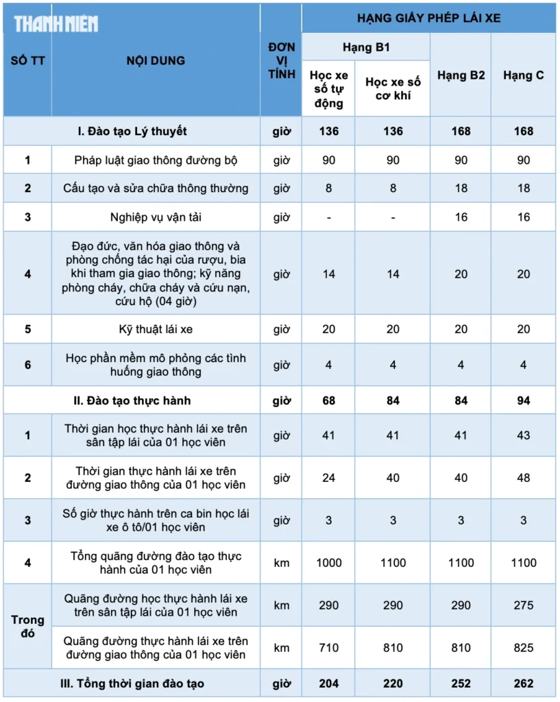 Thời gian đào tạo thực hành giảm xuống, do đó tổng thời gian đào tạo các hạng xe B1, B2 và C cũng đã được rút ngắn xuống so với trước đây, cụ thể: Hạng xe B1 xe số tự động giảm còn 204 giờ, xe số cơ khí giảm còn 220 giờ; Hạng xe B2 giảm còn 252 giờ và hạng C giảm còn 262 giờ.